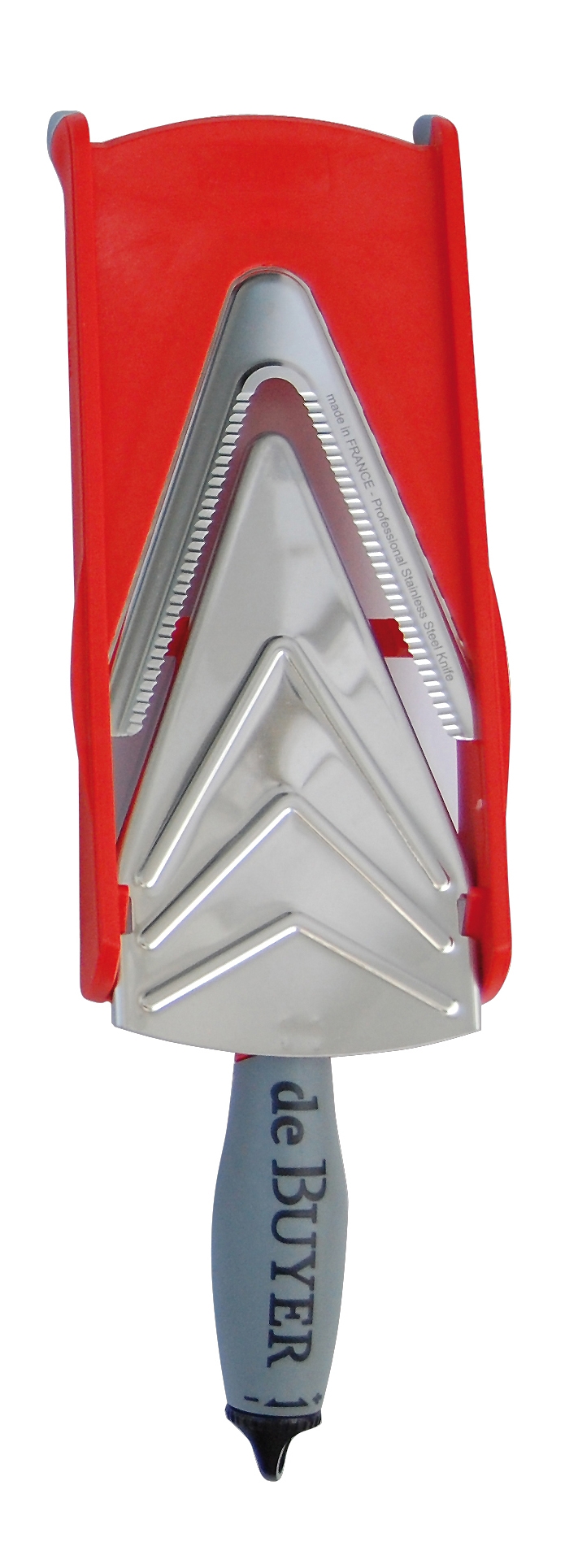 Le coupe tranche ou la mandoline Kobra de la marque française De Buyer a un tranchant idéal grâce à sa lame en forme de V crantée.