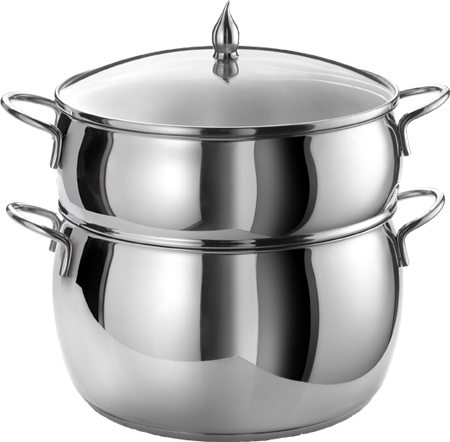 - Ensemble 3 pièces : 1 demi-traiteur bombé en inox brillant ; 1 panier à semoule bombé en inox brillant ; 1 couvercle en verre cerclé inox