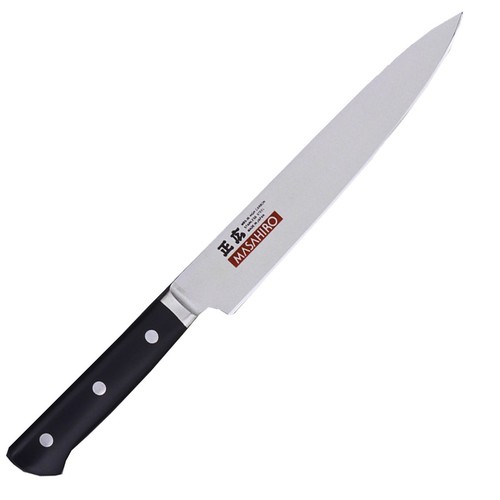Le couteau à découper Masahiro M14 est un couteau à trancher japonais à la forme très occidentale, adaptée aux besoins spécifiques de la cuisine française.Il bénéficie pourtant des performances exceptionnelles des couteaux japonais : acier de qualité supérieure, finesse de la lame, et tranchant exceptionnel.