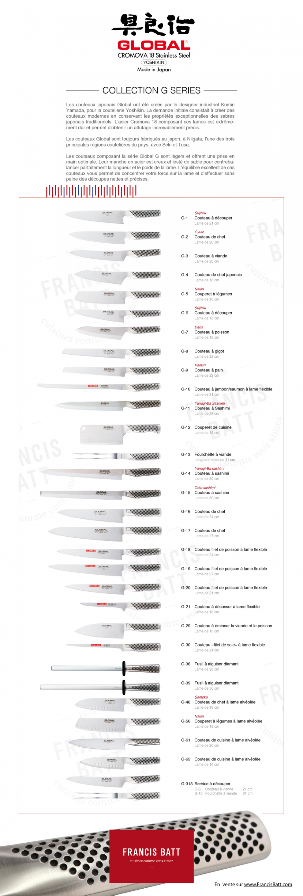 Les couteaux japonais Global ont été créés par le designer industriel Komin Yamada, pour la coutellerie Yoshikin. La demande initiale consistait à créer des couteaux modernes en conservant les propriétés exceptionnelles des lames traditionnelles japonaises. Les couteaux Global sont toujours fabriqués au japon, à Niigata, l’une des 3 principales régions coutelières avec Seki et Tosa.