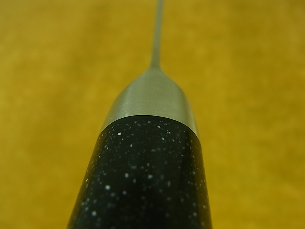 Cette dureté exceptionnelle permet d'effectuer un aiguisage très précis et d'obtenir un tranchant rasoir durable. L'opération, réalisée en deux passes sur pierre à grain fin (#3000), nécessite 4 fois plus de temps que l'aiguisage d'une lame Damas.