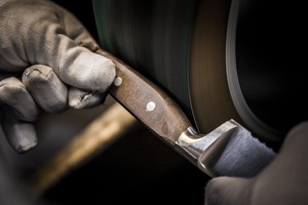 L’unité lame-mitre-platine forgée à partir d’une lame d’acier fortement allié X50CrMoV15 constitue la colonne vertébrale du couteau EPICURE. Les couteaux ont une dureté de 58°HRC, ce qui assure un tranchant optimal, une excellente tenue de coupe et une grande flexibilité tout en facilitant l’affûtage.