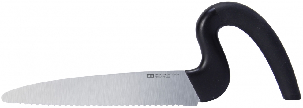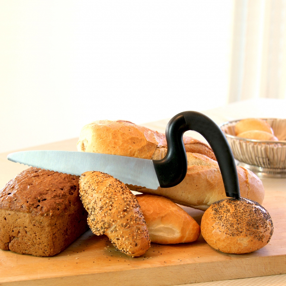 Le couteau à pain « Aergo » possède un manche coudé. Breveté et antidérapant, le manche du couteau à pain Aergo est très confortable.