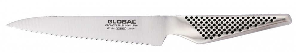 Le couteau à tomate Global GS14 à lame dentée permet une découpe franche et nette des tomates et des autres fruits et légumes à peau dure et chair molle.