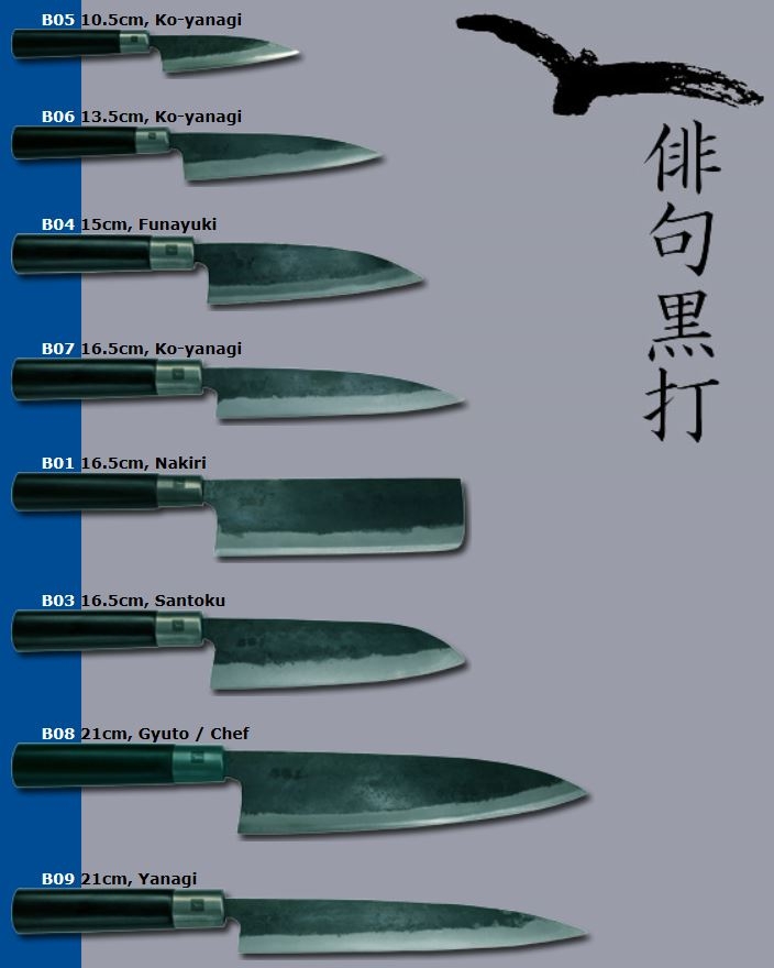 La gamme de couteaux Haiku Kurouchi de la marque Chroma regroupe les 6 couteaux traditionnels japonais : le couteau de chef Gyuto, l'éminceur Santoku, le couperet à légume Nakiri, le couteau long à sashimi et 3 couteaux universels Ko-Yanagi.