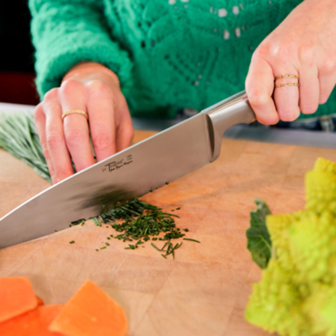 La collection Le Thiers Cuisine revisite le design du couteau Le Thiers pour répondre aux exigences de la préparation culinaire. Si vous ne deviez choisir qu’un seul couteau, le modèle chef avec sa lame de 20 cm serait l'outil idéal.