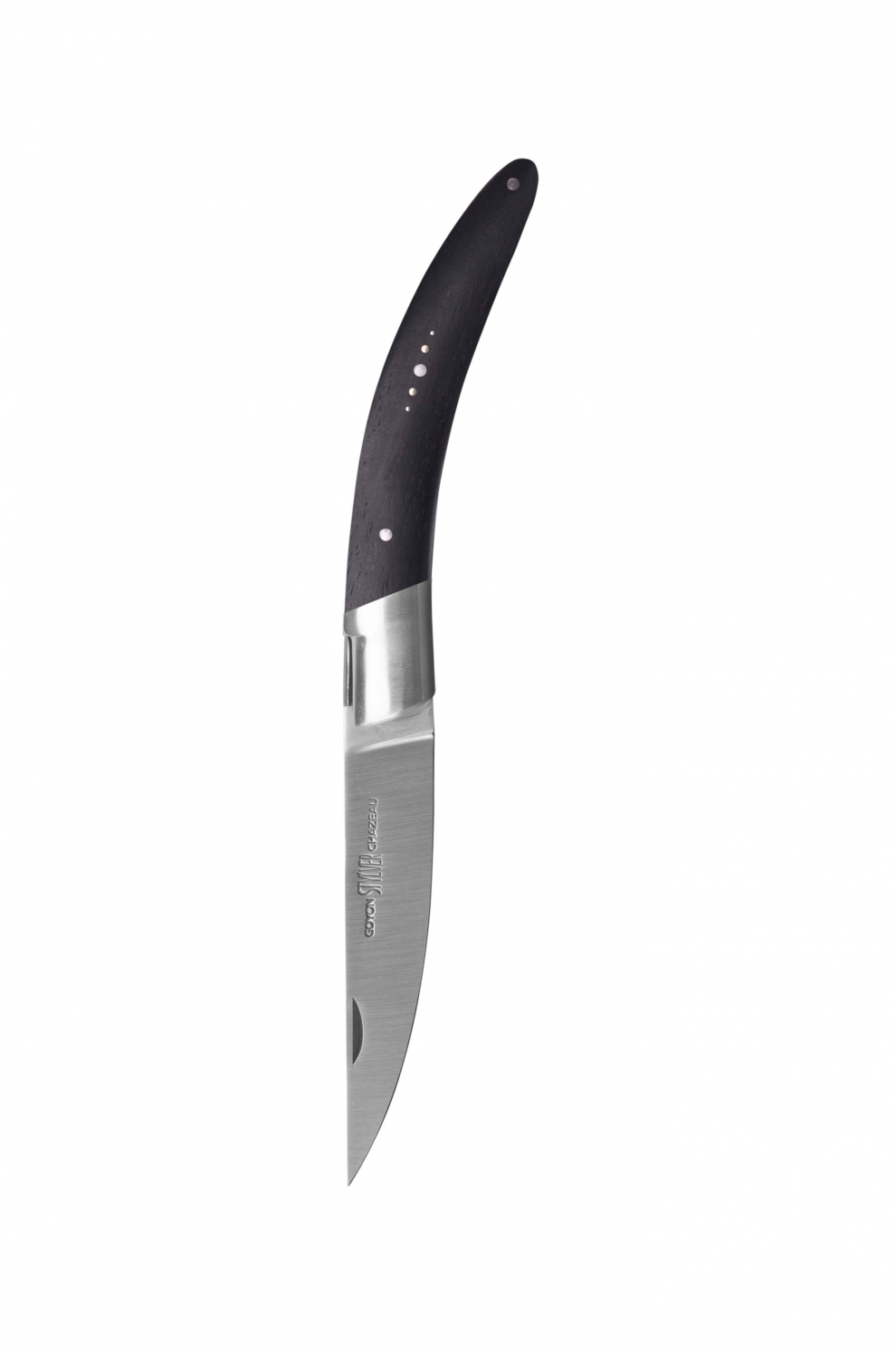 Le manche est composé de 2 plaquettes taillées dans du bois d’ébène, dont la densité et la dureté sont connues et utilisées depuis l’antiquité égyptienne. Finement pailletée de cristaux d’acide oxalique, l’ébène offre un aspect scintillant à la lumière. Ce modèle du Stil’ver dit « Plein manche », son manche est entièrement en bois, et ne possède pas de mitre au niveau de la lame.