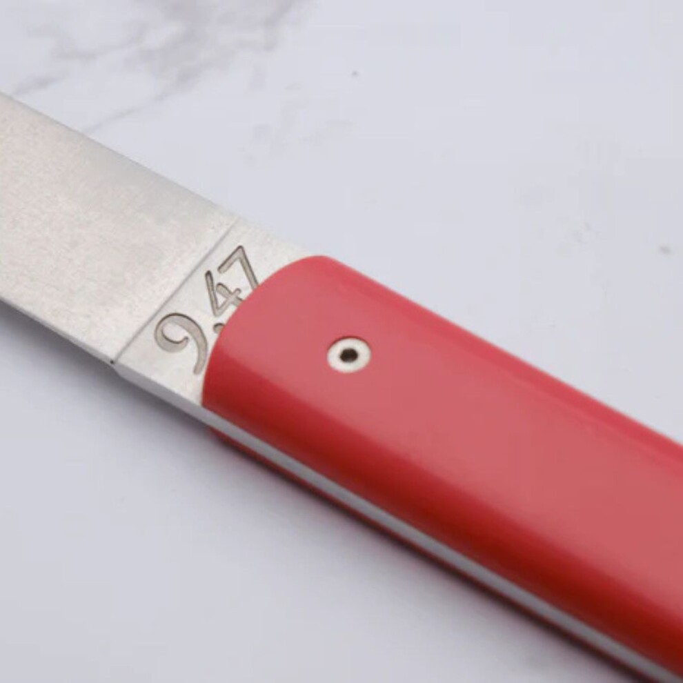 Les plaquettes du manche du 9.47 sont composées de POM rouge (PolyOxyMéthylène), un polymère créé par la société DuPont de Nemours. Ce matériau composite bénéficie de toutes les propriétés nécessaires à couteau de qualité : dureté, rigidité, résistance aux chocs et faible absorption d’humidité.