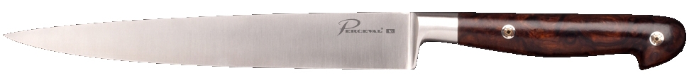 Le couteau à fileter Perceval est un couteau monté en plate-semelle amincie. Sa lame se poursuit pour former le manche. Les deux parties sont solidaires et le couteau ne peut pas se casser en deux. Des plaquettes en loupe de Bois de Fer, fixées de chaque côté de la semelle, complètent esthétiquement ce manche, la semelle restant visible sur les côtés du couteau. La loupe de Bois de Fer est un bois exotique lourd, et dense et très résistant dans le temps.
