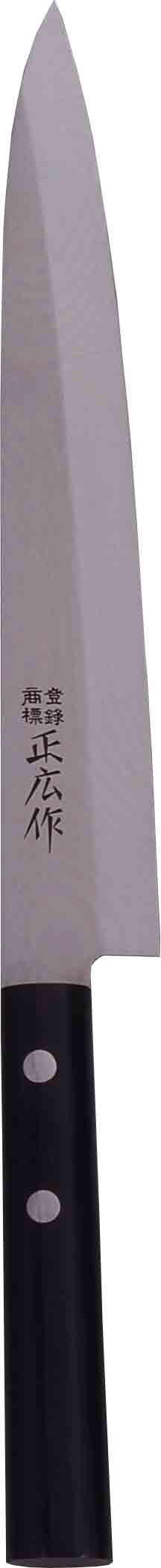 Véritable couteau traditionnel japonais, le Yanagiba Masahiro M20 possède une lame longue, mince et effilée en forme de « feuille de saule ». Celle-ci bénéficie d'une émouture asymétrique, dite « Chisel », particulièrement importante pour la découpe des sushis, mais qui limite son usage. Ce couteau est destiné à un droiter.