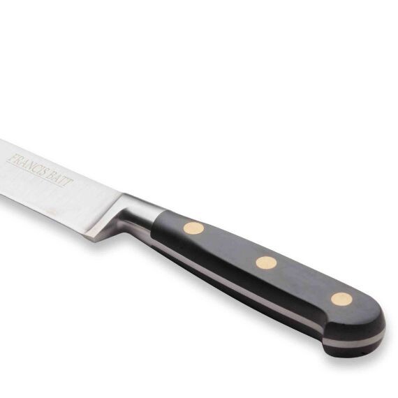 Maîtrisez l'art de la découpe de poisson avec le Couteau suédois forgé Pro lame flexible de 22 cm, doté d'un manche noir élégant et de rivets en laiton. Ajoutez ce couteau exceptionnel à votre collection de couteaux et découvrez comment il élève chaque découpe à un niveau supérieur de performance culinaire. Comptez sur Francis Batt pour l'excellence à chaque levée de filet.