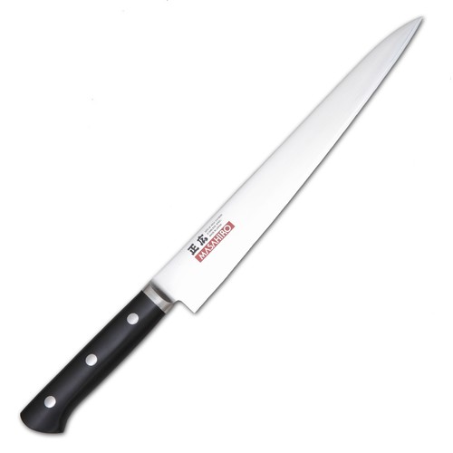 Le couteau Sujihiki M11 de la marque Masahiro est le parfait couteau à découper : d'une forme légèrement différente du couteau à découper arrondi, le fil de coupe ne présente pas de courbure.