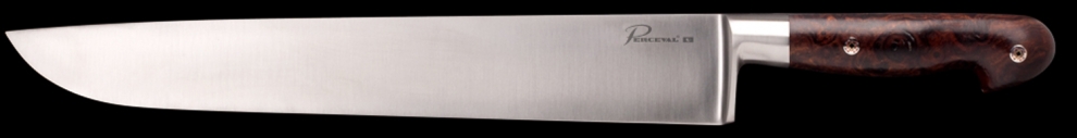 Le couteau à désosser Perceval est un couteau monté en plate-semelle amincie. Sa lame se poursuit pour former le manche. Les deux parties sont solidaires et le couteau ne peut pas se casser en deux. Des plaquettes en loupe de Bois de Fer, fixées de chaque côté de la semelle, complètent esthétiquement ce manche, la semelle restant visible sur les côtés du couteau. La loupe de Bois de Fer est un bois exotique lourd, et dense et très résistant dans le temps.