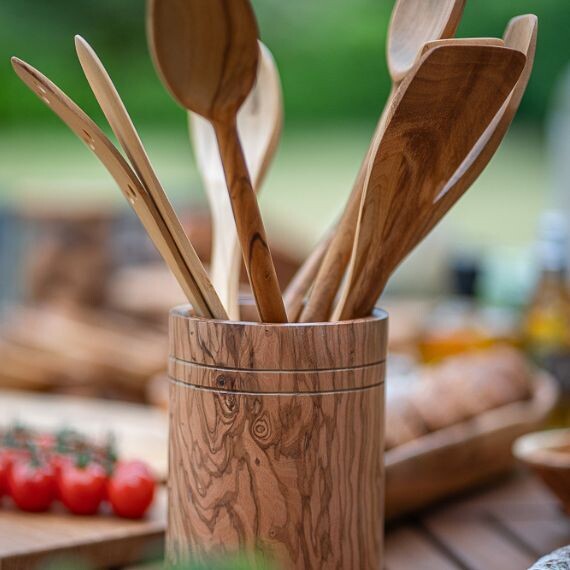 Chaque pièce de cet ensemble est sculptée à la main dans du bois d'olivier, réputé pour sa résistance exceptionnelle, sa beauté naturelle et son caractère intemporel. Les finitions satinées ajoutent une touche moderne et sobre, apportant à votre table une esthétique design et agréable.