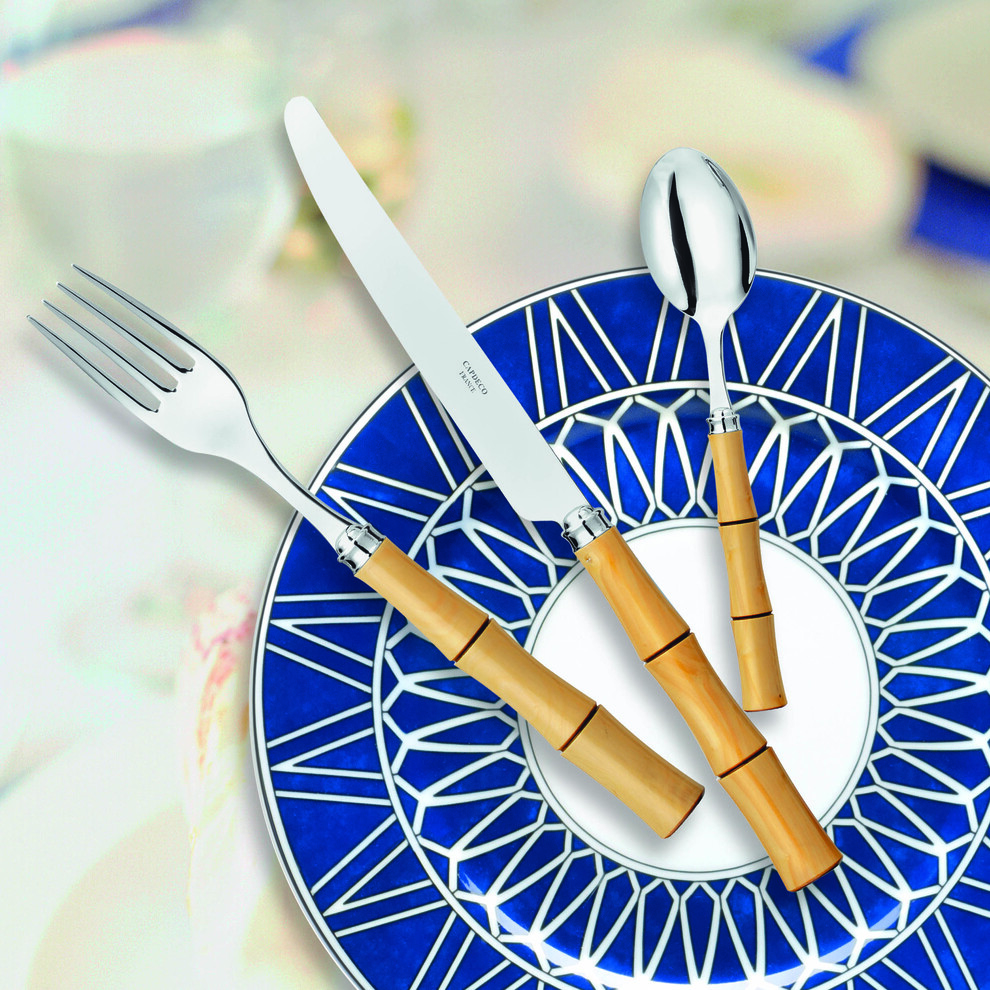 Découvrez une collection en buis véritable clair, dotée d'une finition en acier inoxydable. Cette collection se mariera merveilleusement avec une table moderne et colorée.