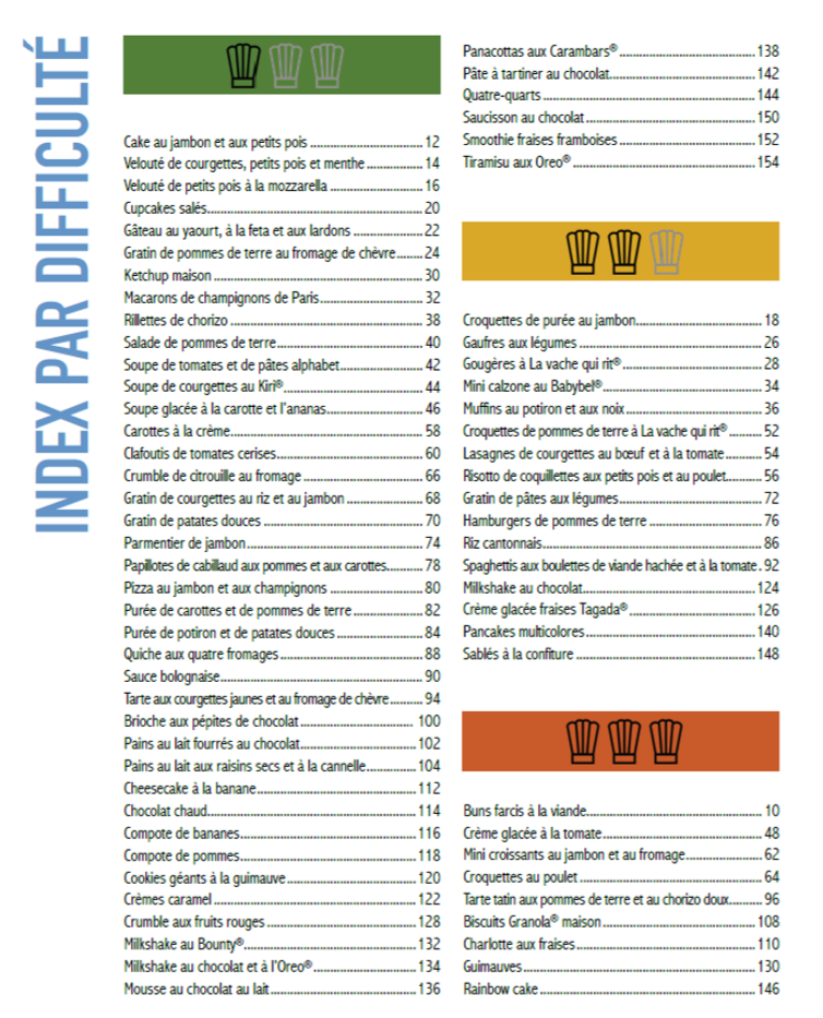 Les recettes sont indexées par envie ou par difficulté, à vous de choisir !