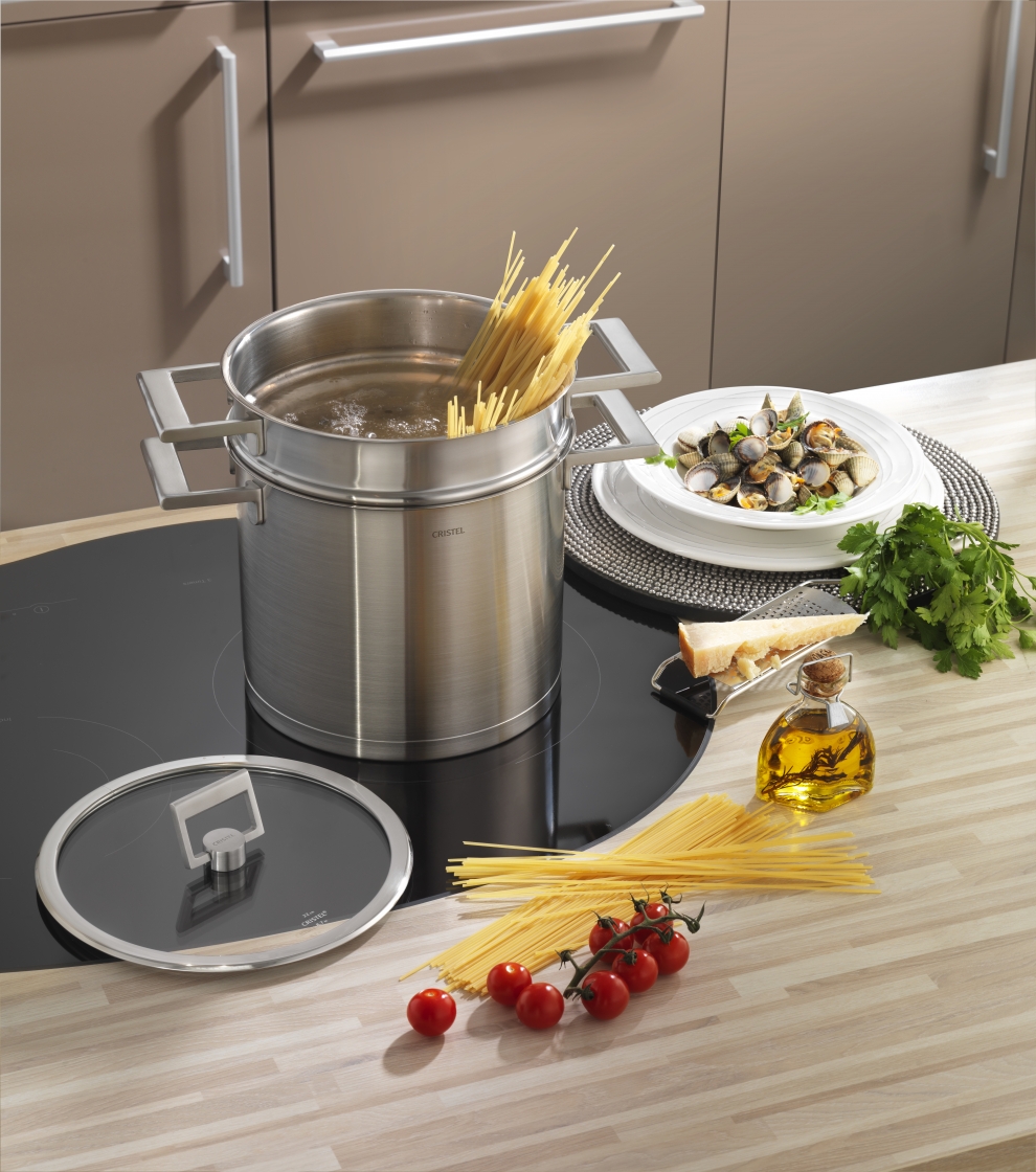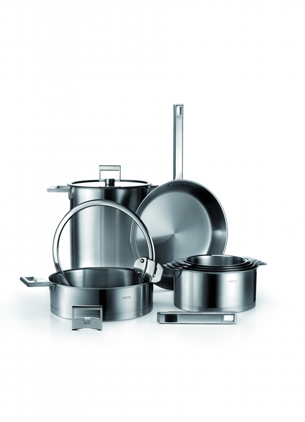 Des couvercles plats en verre cerclés inox, avec des poignées confortables et rabattables (pour le rangement), viennent également coiffer la ligne pure de cette collection. Chaque couvercle vient se loger entre 2 faitouts empilés.