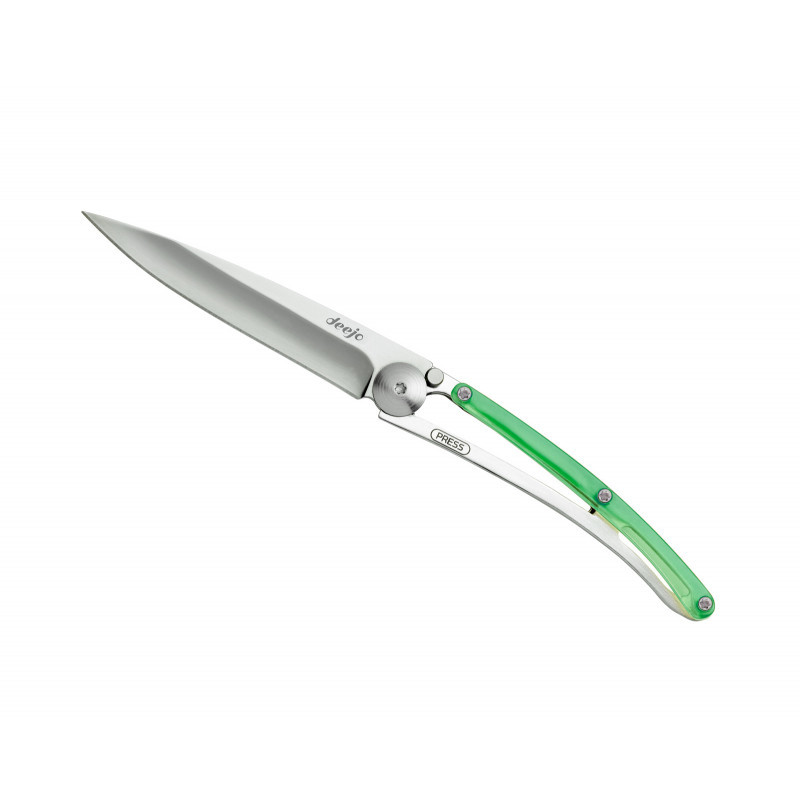Ultra-léger, le DEEJO COLORS vert ne pèse que 27 grammes. Conçu en acier inoxydable 420 finition miroir, la plaquette du manche est, elle, fabriquée en polycarbonate vert translucide qui offre une transmission de la lumière supérieure à celle du verre. Eblouissant, ses matériaux lui garantissent une excellente résistance thermique, vous permettant de l'utiliser à des températures allant de -135°C jusqu'à 135°C.