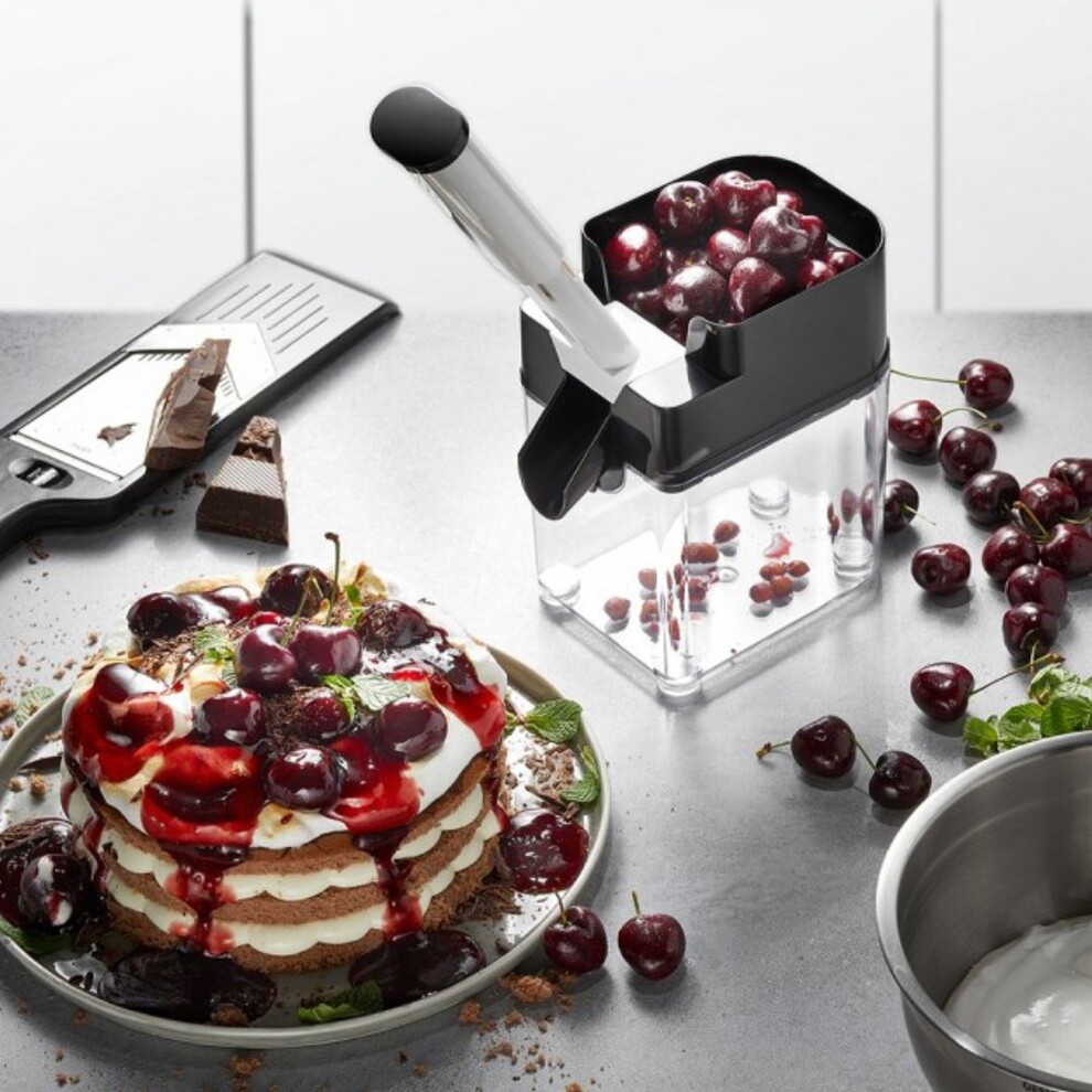 Le dénoyauteur de cerises Corer est très simle à utiliser. Il vous suffit de remplir la coquille supérieure avec des cerises et de presser le poinçon. Les graines tombent dans le grand récipient de collecte, le résultat fruité glisse latéralement dans un bol séparé.
