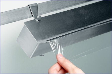 En inox brossé, adaptable aux barres Panoply, son rebord dentelé découpe avec précision film et papier d'aluminium.
