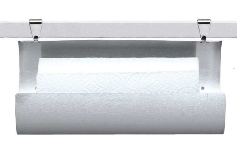 Simple feuille d'inox pour y déposer un rouleau de papier essuie-tout que l'on découpe à volonté sur la tranche.