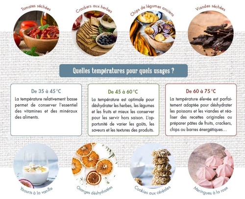Son principe de séchage repose sur une distribution horizontale d'air chaud sur chaque plateau pour un séchage homogène. Disposant de temperature de sechage reglable, il vous permettra de choisir entre conservation des nutriments ou des mineraux en fonction de la temperature séléctionnée. Sa simplicité d'utilisation vous épatera: son panneau de commande à affichage digital avec un guide des températures de séchage allant de 35 à 75°C est très intuitf. Avec ses dix plateaux modulables vous disposerez d'une surface de sechage totale de 10 400 cm² (28,5 x 36,5 cm par plateau). Ces plateaux sont d'ailleurs compatible avec lave vaisselle.