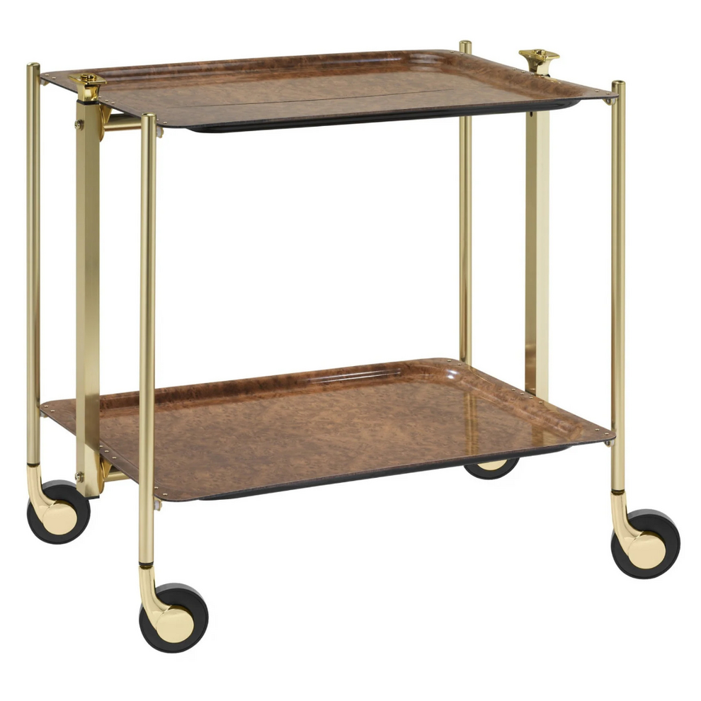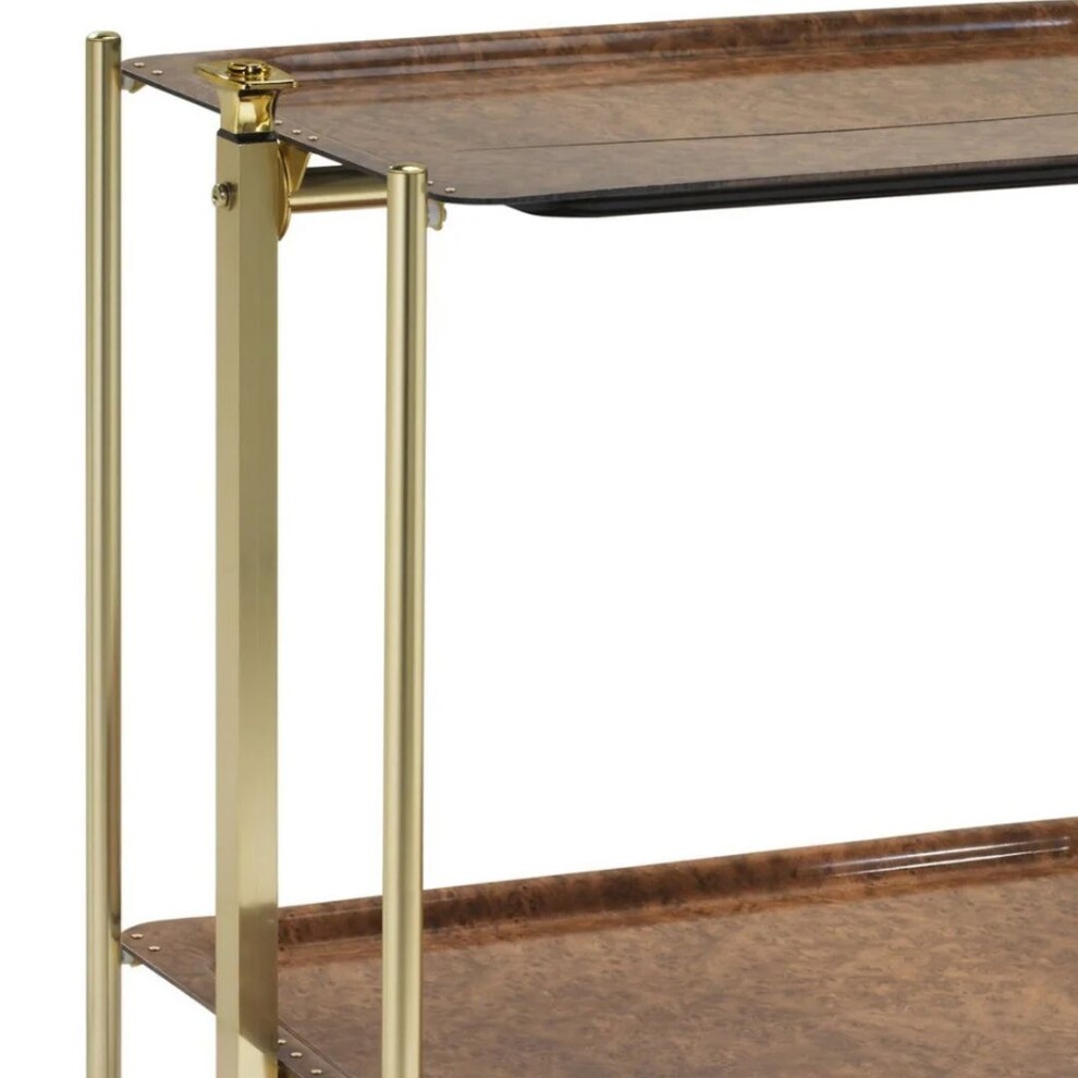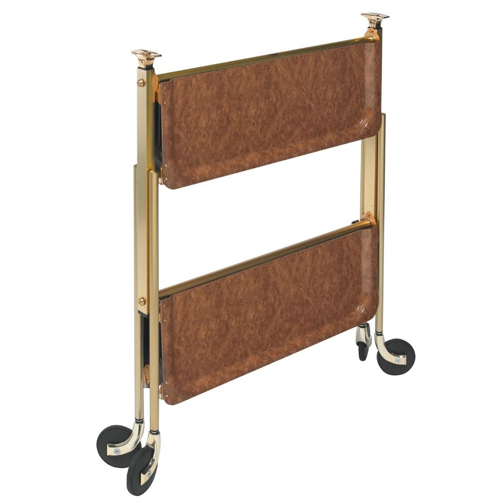 Desserte roulante et pliante 2 étages montants dorés plateaux stratifiés Loupe foncé