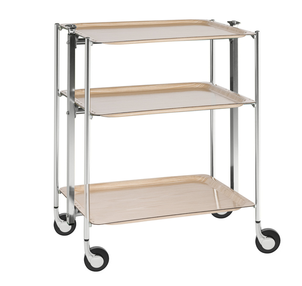 Desserte roulante et pliante 3 étages montants chromés plateaux stratifiés bois
