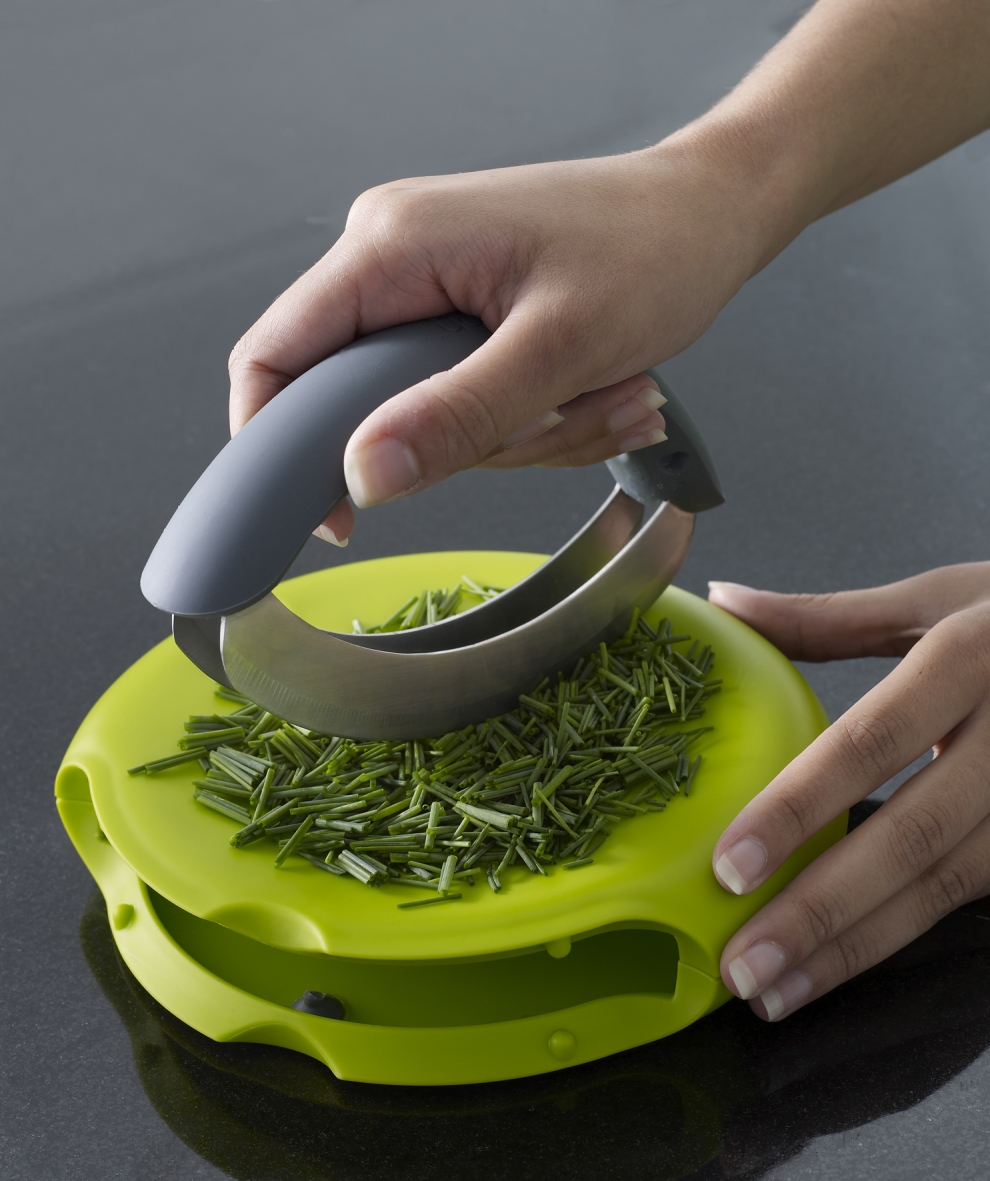 Pratique et ergonomique, ce hachoir dispose de deux lames et de son propre support. Parfait pour hacher des herbes, de l'ail, des légumes, ... (passe à la machine)