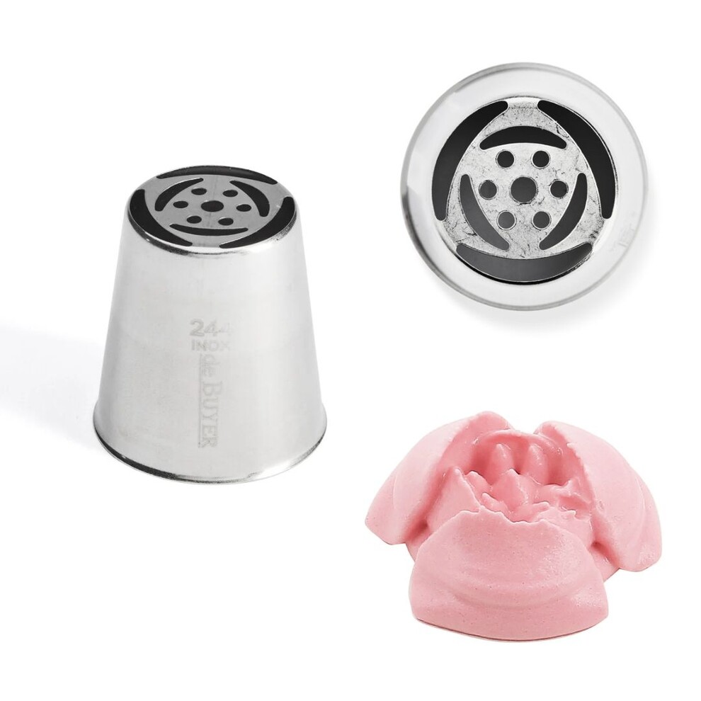 La douille russe à multiples ouvertures permet de confectionner des fleurs en crème pour réaliser des décors d'entremets originaux.