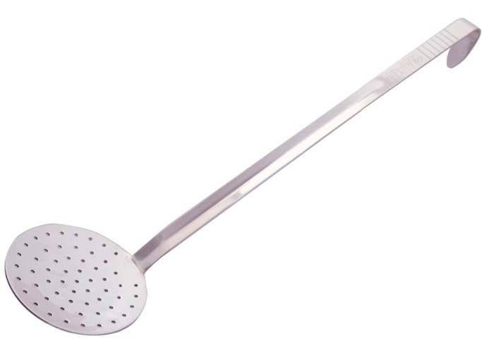 Pour récupérer et égoutter les aliments remontés à la surface du liquide de cuisson. Ustensile professionnel en acier inoxydable robuste. Manche large, épaisseur 2,5 mm, très rigide.