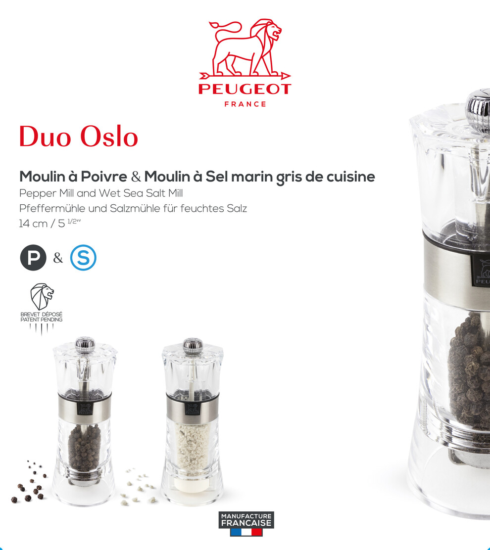 Elégant, cet ensemble de moulins à sel et à poivre Peugeot Oslo est fabriqué en acryl et en inox et habillera de lumière votre table. Grâce à la vis située sur le dessus du moulin, réglez à votre guise la mouture du poivre : plus la vis est serrée, plus la mouture est fine.