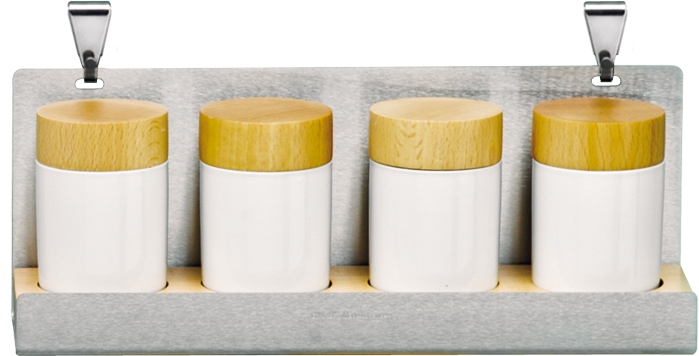 En inox brossé l'étagère, à suspendre aux barres Panoply, contient 4 pots en porcelaine blanche.