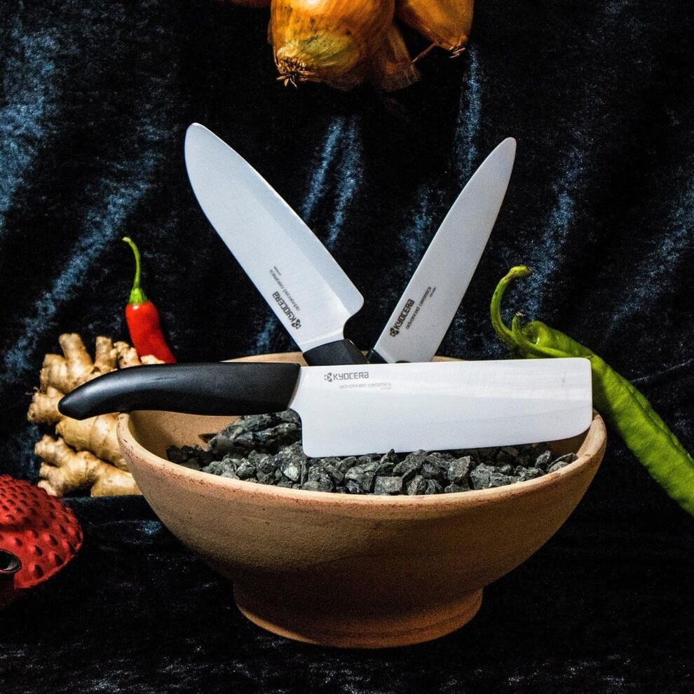 Les lames sont fabriquées en zircone céramique, un matériau high-tech d’une exceptionnelle dureté qui leur assure une résistance à l’usure incomparable. Chaque couteau est ensuite affûté manuellement pour atteindre un tranchant optimal et d’une précision extrême.