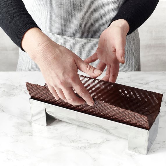 Cette gouttière démontable en acier inoxydable parfaite pour la réalisation de bûches, terrines, gâteaux, glaces, pour le montage à froid, la confection de décors en chocolat...