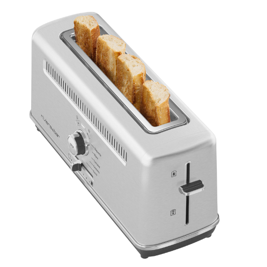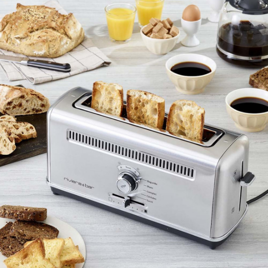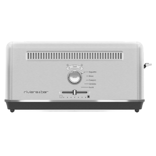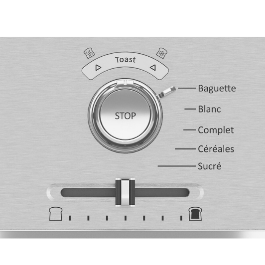 Ses deux fentes extra-longues de 26 cm et extra-larges de 4 cm sont dotées du système auto-centrage pour dorer les tranches de chaque côté, que vous pouvez interrompre à tout moment grâce à la fonction Stop. Doté de 5 programmes (Baguette, Blan, Complet, Céréales, Pain sucré), et de 5 fonctions spéciales (Dorage, Réchauffage, Pain congelé, Stop), ce grille pain s'adapte à tous les types et tailles de pains : pain de mie, baguette, brioche ...