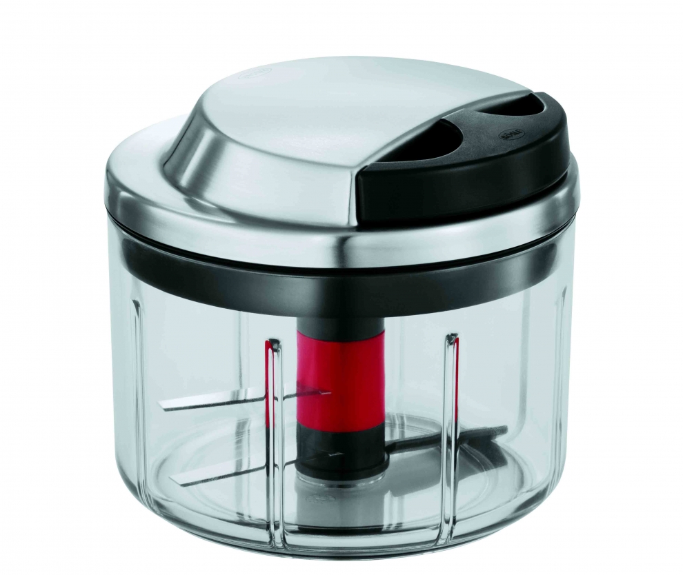 Mécanisme de coupe breveté avec deux lames amovibles pour couper en petits morceaux et hacher fines herbes, légumes, fruits.