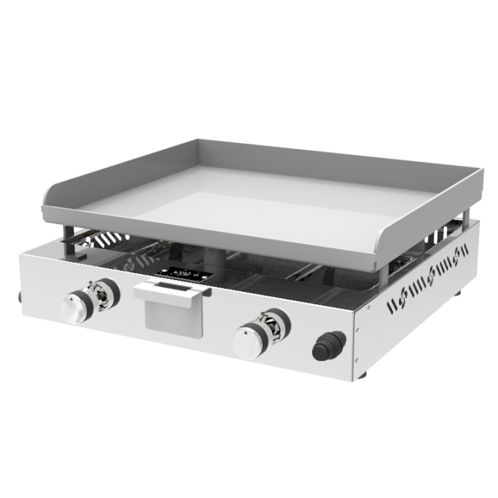 Le châssis est réalisé en inox brossé. La plaque de cuisson est en INOX 304L alimentaire de 4 mm d’épaisseur. Il y a deux brûleurs en inox indépendants 2 x 2 Kw équipés d'un thermocouple de sécurité. Les boutons de réglage du gaz sont de couleur noir et chrome en aluminium et zinc. L'allumage est électrique (Pile LR06 non fournie).