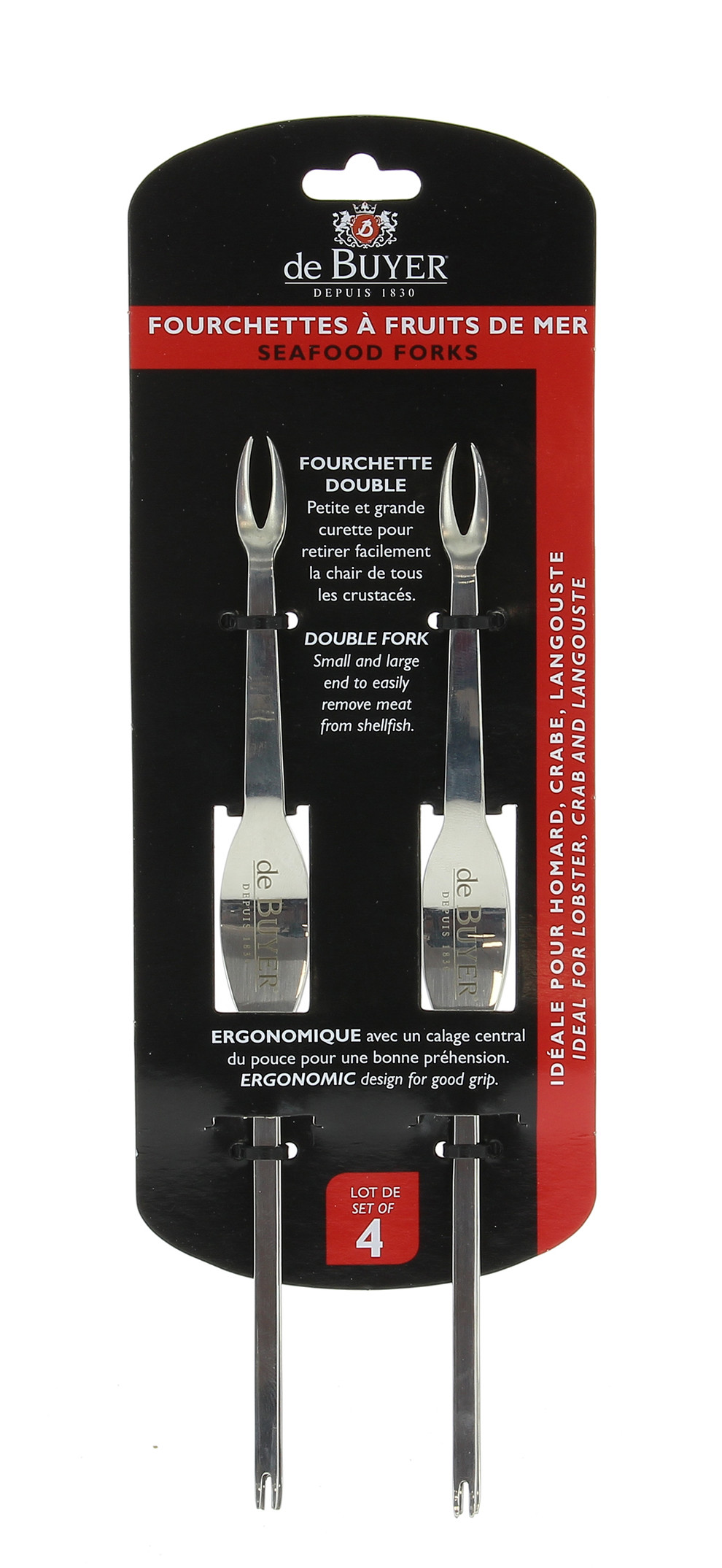 Les 4 curettes à crustacés doubles en inox DE BUYER seront vos alliées incontournables pour déguster sans difficulté vos plateaux de fruits de mer et notamment vos crabes, homards et langoustes. Chaque fourchettes est équipées de 2 embouts : un embout curette plus petit pour les petits crustacés et un embout fourchette pour retirer facilement la chair. Sa forme ergonomique avec un calage central vous permettra une bonne prise en main. Longueur 21 cm.