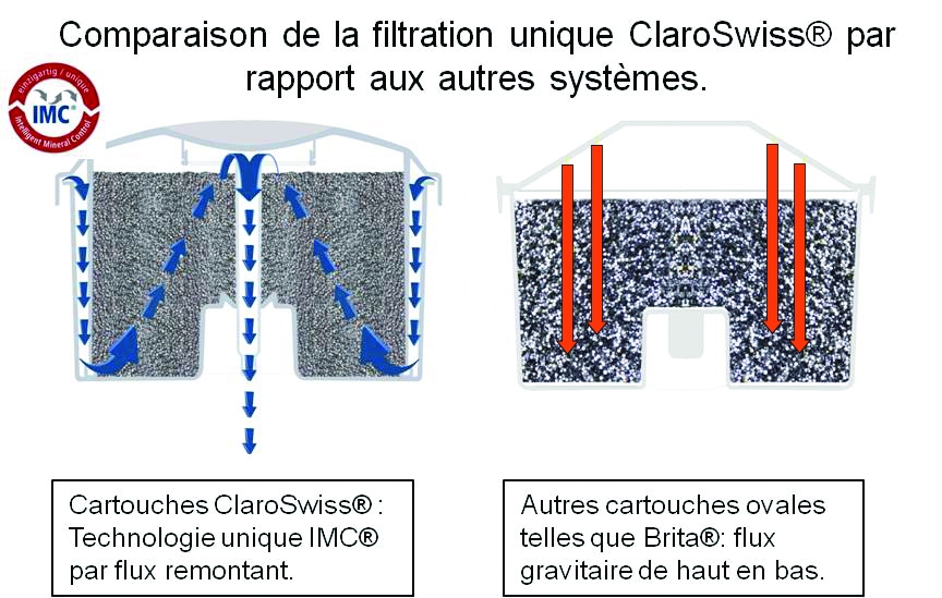 Grâce à la technologie gravimétrique unique par flux remontant avec IMC® (Intelligent Mineral Control - Contrôle Intelligent des Minéraux), les cartouches Maxima ClaroSwiss préservent une concentration équilibrée des minéraux comme le calcium et le magnésium, bénéfiques pour la santé, tout en assurant une réduction de la dureté de l'eau filtrée, ce qui évite le dépôt de tartre dans les appareils électroménagers.
