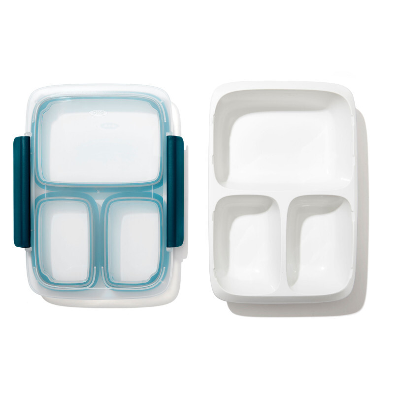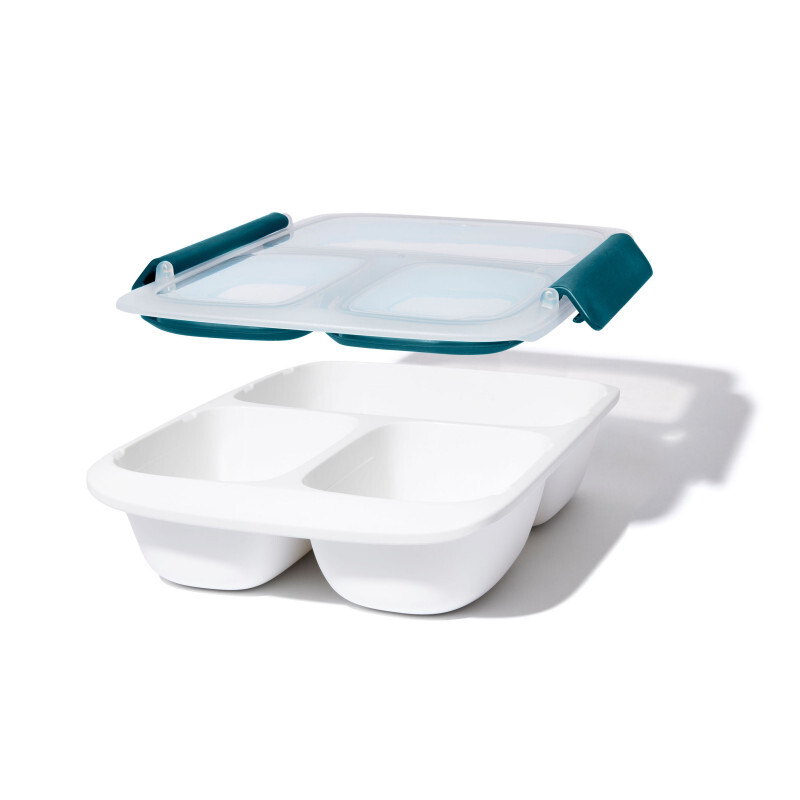 Vous pouvez désormais préparer vos meilleurs repas et les transporter en toute sécurité, grâce aux clips de fermeture de chaque côté et au joint en silicone robuste et durable. Les 3 compartiments vous permettent d’emmener plusieurs préparations sans les mélanger. Unique en son genre, chaque compartiment est hermétique et donc totalement indépendant les uns par rapport aux autres. Chaque aliment est donc préservé des autres et garde sa texture et ses saveurs.