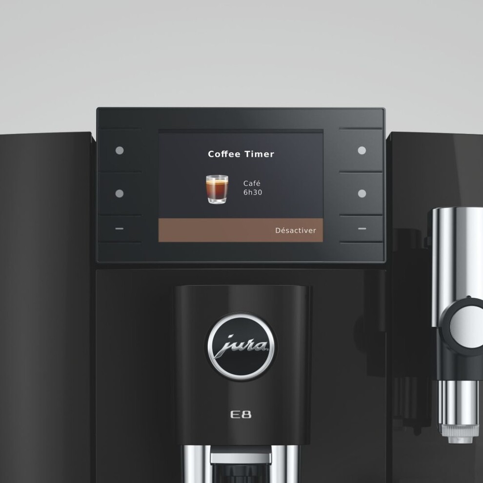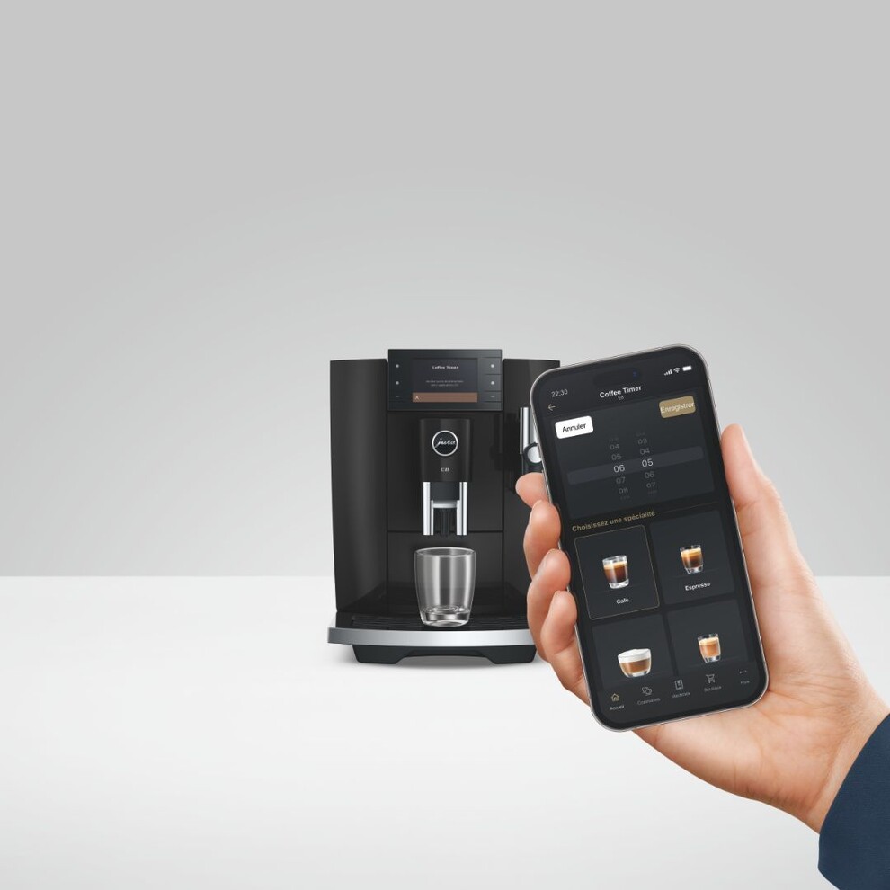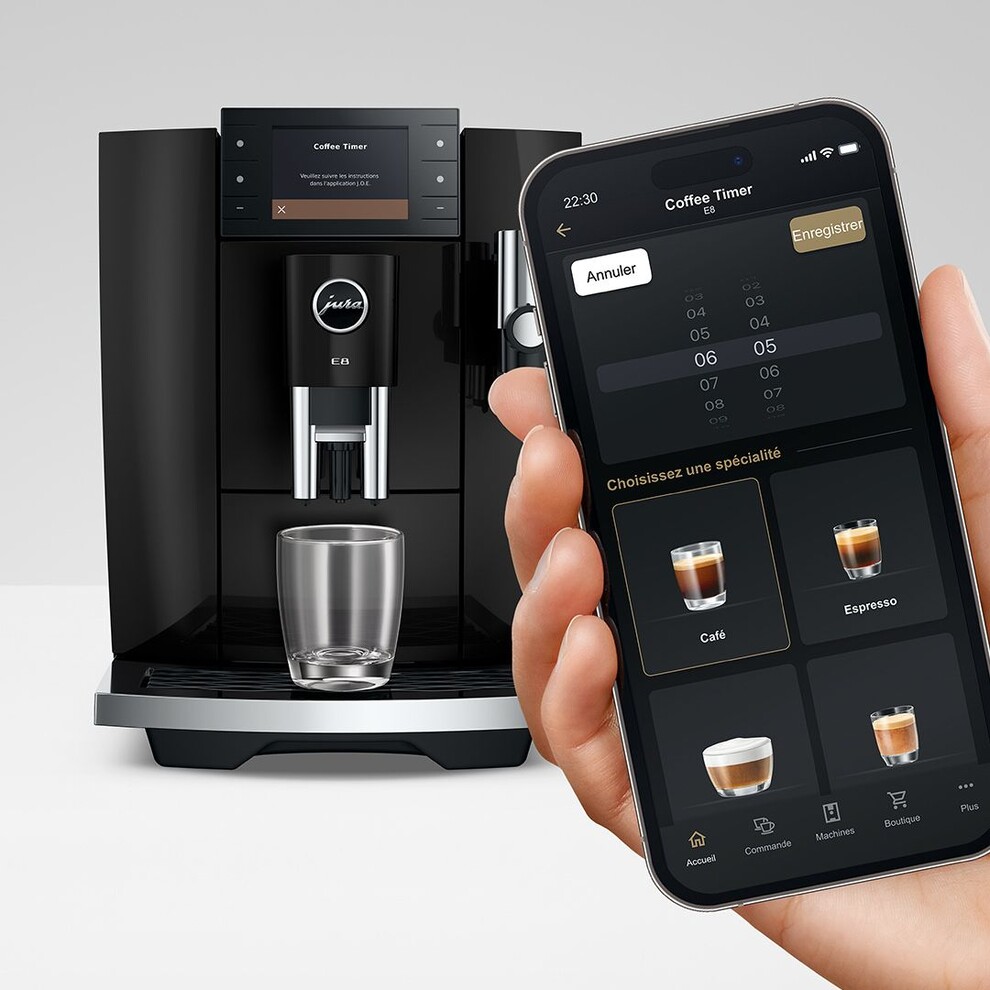 L'E8 pense à vous, même avant votre réveil. Grâce au Coffee Timer piloté depuis l'application J.O.E.®, programmez votre café du matin et savourez-le fraîchement moulu au moment où vous posez le pied à terre. Une façon élégante et connectée de commencer la journée.