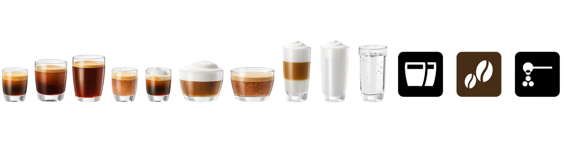 Espresso, 2x Espresso, Café, 2x café, Americano, Café spécial, Lungo, Cortado, Expresso macciato, Cappacuccino, Cappacuccino extra shot, Flat white, Falt white extra shot, Latte macchiato, Latte macchiato extra shot, Portion de mousse de lait, Eau chaude.