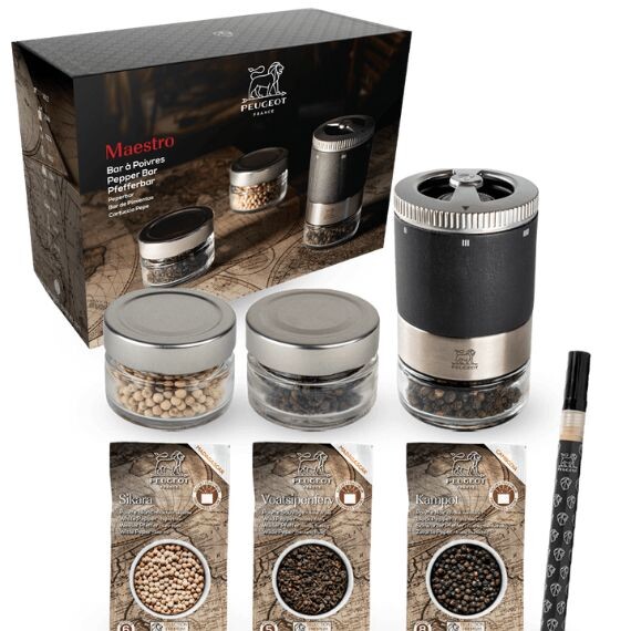 le Bar à poivres Maestro est l'instrument parfait pour partir à la découverte du monde des poivres. D’un simple geste, le moulin passe d’un cru de poivre, à l’autre.