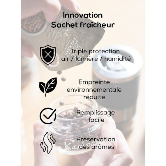 - 3 poivres premium présentés dans des sachets fraicheur hermétiques pour une conservation optimale : Poivre noir Kampot - 20g / Poivre blanc Sikara - 20g / Poivre sauvage Voatsiperifery – 20g