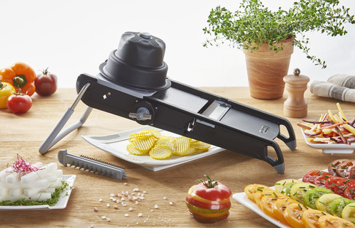 En alternant les lames horizontales lisse ou ondulées et les peignes juliennes, et en ajustant l’épaisseur de coupe, vous pouvez réaliser des juliennes, des dés, des rondelles, des coupes gaufrées de vos fruits et légumes selon vos envies.