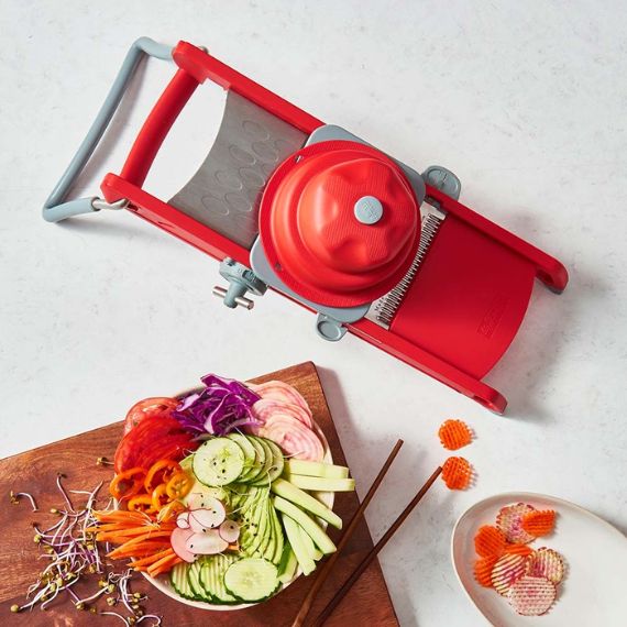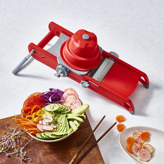 Avec la Mandoline Swing plus rouge De Buyer, la découpe de vos fruits et légumes devient facile et nette !