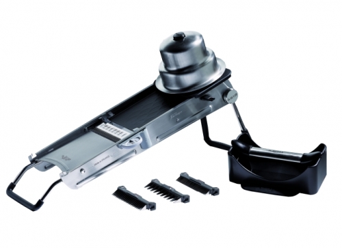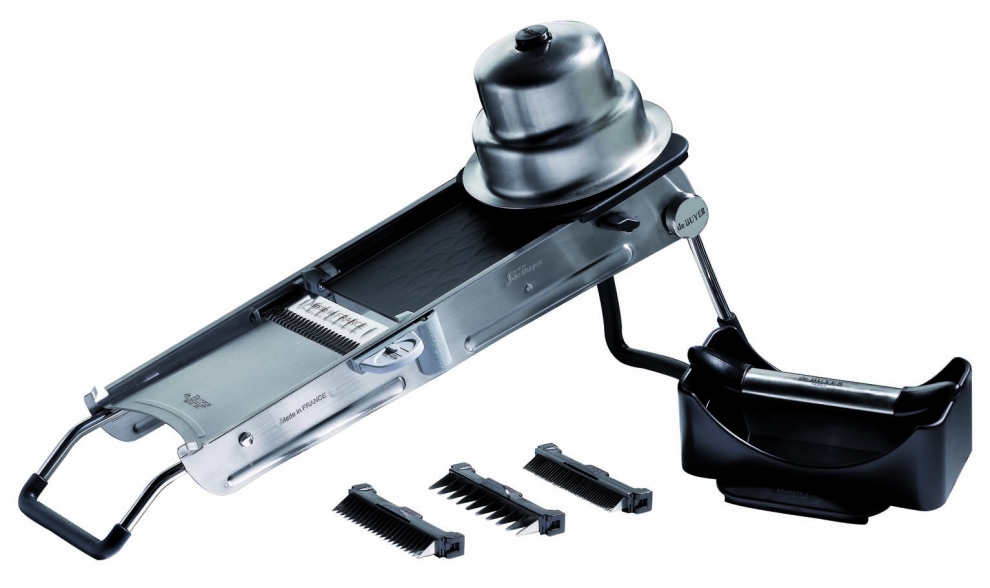 Mandoline complète avec chariots et poussoirs avec une 1 double lame horizontale ( lisse / ondulée ) et 3 peignes Julienne (2-4-10 mm)