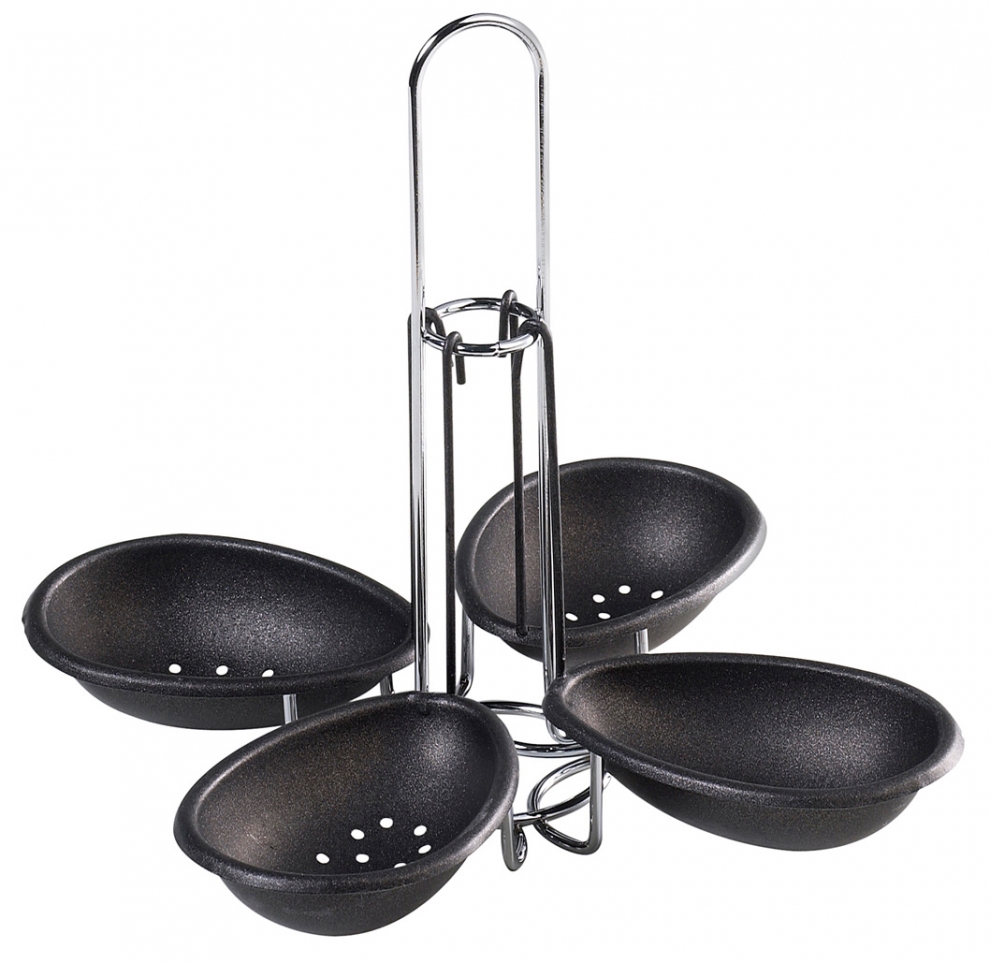 Manège à 4 oeufs pochés anti-adhérente. Astucieux pour réussir en un tour de main, grâce à son revêtement anti-adhérent, les oeufs pochés qui accompagnent salades et épinards ou pour réaliser des omelettes.