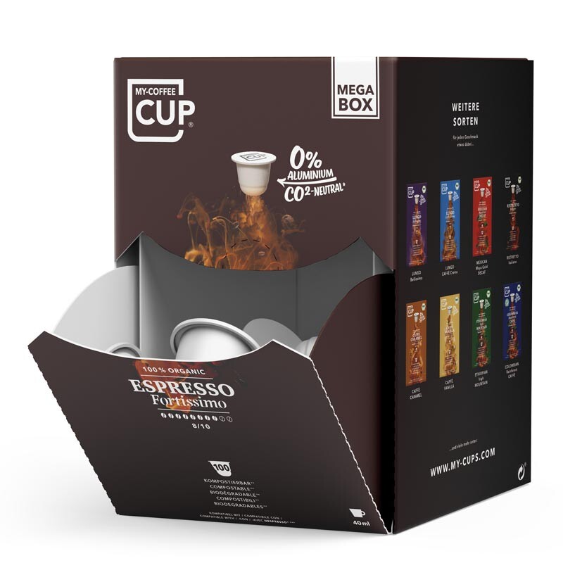 Accueil > Maison > Épicerie > Mégabox de 100 capsules biodégradables de café Espresso Fortissimo